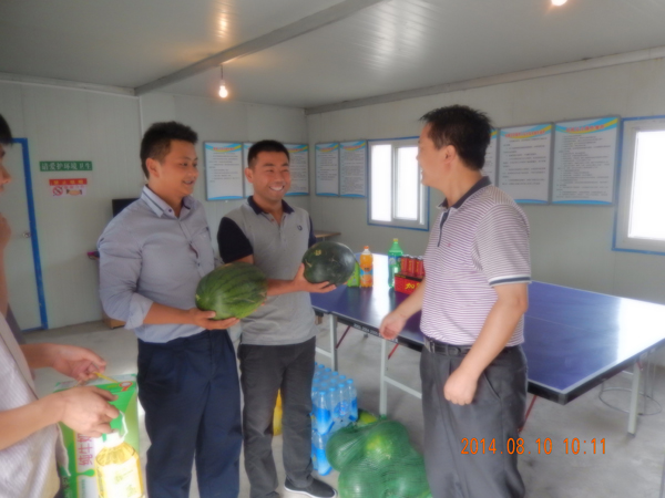 2014年8月8日上午,西北水電公司總工程師周彩貴代表公司工會,在玉門抽水蓄能電站勘探工程項目部檢查指導工作的同時,購買了西瓜、飲料、涼茶等食品對項目部進行了慰問。詳細了解員工生產(chǎn)、生活情況,認真聽取職工心聲。對項目部人員克服困難,在高溫酷暑下踏實工作的精神和在工程進度、質(zhì)量、安全生產(chǎn)等方面取得的成績給予了肯定。
